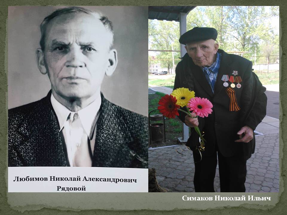 Мой дед- Симаков Николай Ильич (13.11.1927-26.06.2017). Родился 13 ноября 1927 года в небольшом селе Широкоис Пензенской Губернии, рано осиротел ( мама умерла, когда ему было 12 лет, отец погиб в первые дни войны при форсировании Днепра). В 1944 году Николай был призван в армию, где был направлен в Восточную Пруссию город Кёнигсберг, где получил контузию. В госпитале пролежал полтора года, где за ним ухаживала санитарка – землячка Мария родом из г. Кузнецк), благодаря которой он выжил. Пребывая в госпитале Николай встретил тот самый лучший День Победы! 30 декабря 1946 года Николай был уволен в запас. Дедушка прожил очень длинную, но сложную жизнь, про которую рассказывал нам своим внукам. Похоронен он на родной земле в селе Широкоис. 19.02.1996 году получил медаль «Жукова» и грамоту Маршала Советского Союза -Жукова Георгия Константиновича. Значок «Фронтовик» 1941-1945 гг. получил 9 мая 2000 года. Горжусь тобой мой, дед родной, За подвиг твой - поклон земной! За годы, прожиты в бою, За то, что Я сейчас живу Тебя, мой дед, БЛАГОДАРЮ! (ведущий специалист Райкова И.Н.) Мой дед- Любимов Николай Александрович Родился 15 января 1920 года в с.Чернавка Красивского района Тамбовской области. 10 октября 1940 года призван в ряды Красной Армии. Принимал участие в Великой Отечественной войне с 27 июня 1941 года по 9 мая 1945 года. Имеет награды: медали «За боевые заслуги» 1945 г., «За победу над Германией», «За победу над Японией» 1945 г., «За оборону Москвы» 1985 г., орден «Отечественной войны 2 степени» 16.04.1985 г. (помощник судьи Васильева А.А.) |